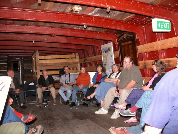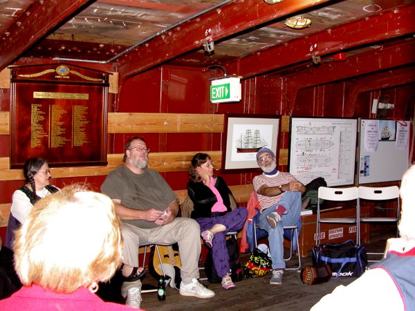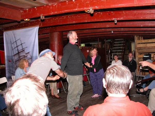 Margaret Walters leads a song from the forebitts